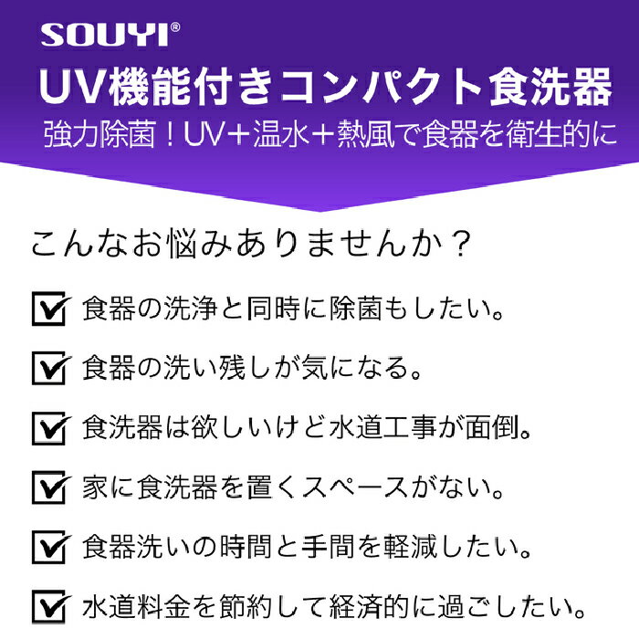 UV食器洗い乾燥機 SY-118UVソウイ 食洗機 食器洗い機 UV除菌 食器乾燥機 高圧洗浄 熱風 経済的 節約 静音 時短 お手入れ簡単 持ち手付き 白 ホワイト ■商品詳細「SOUYI UV機能付きコンパクト食洗器」は新たにUVランプを搭載し除菌機能が付いた食器洗い乾燥機です。